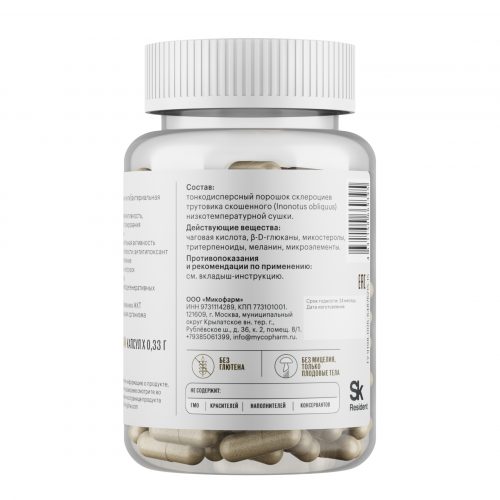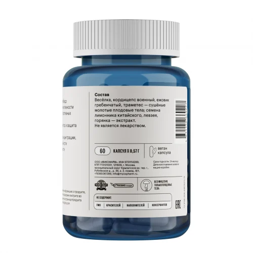 В составе — высококачественное сырье из дикорастущих и культивируемых грибов и лекарственных растений, прошедшее специальную обработку для усиления терапевтического эффекта.
