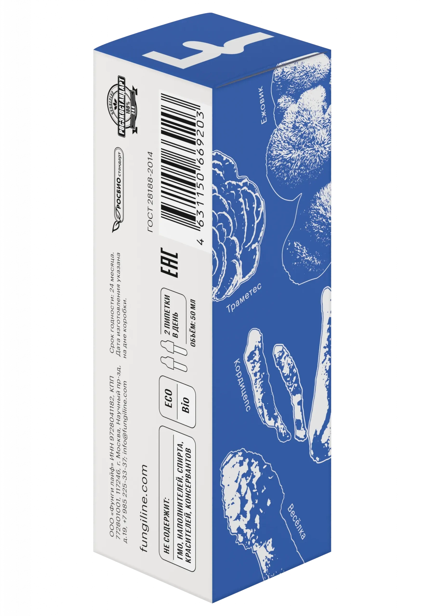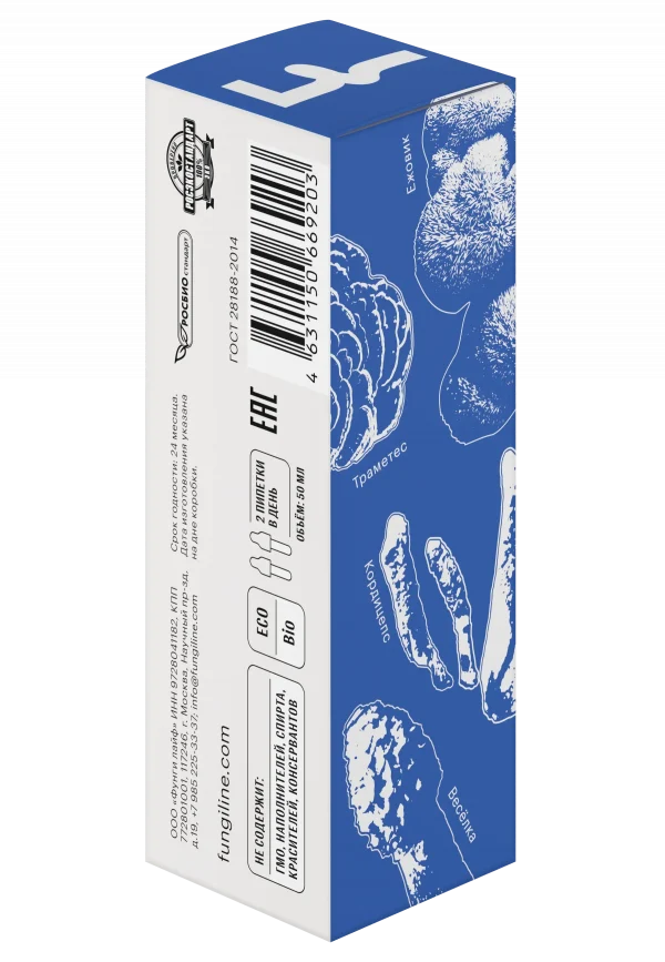 Вода; экстракты плодовых тел веселки, кордицепса военного, ежовика гребенчатого и траметеса (низкотемпературная сушка); экстракты семян лимонника китайского, левзеи и горянки.