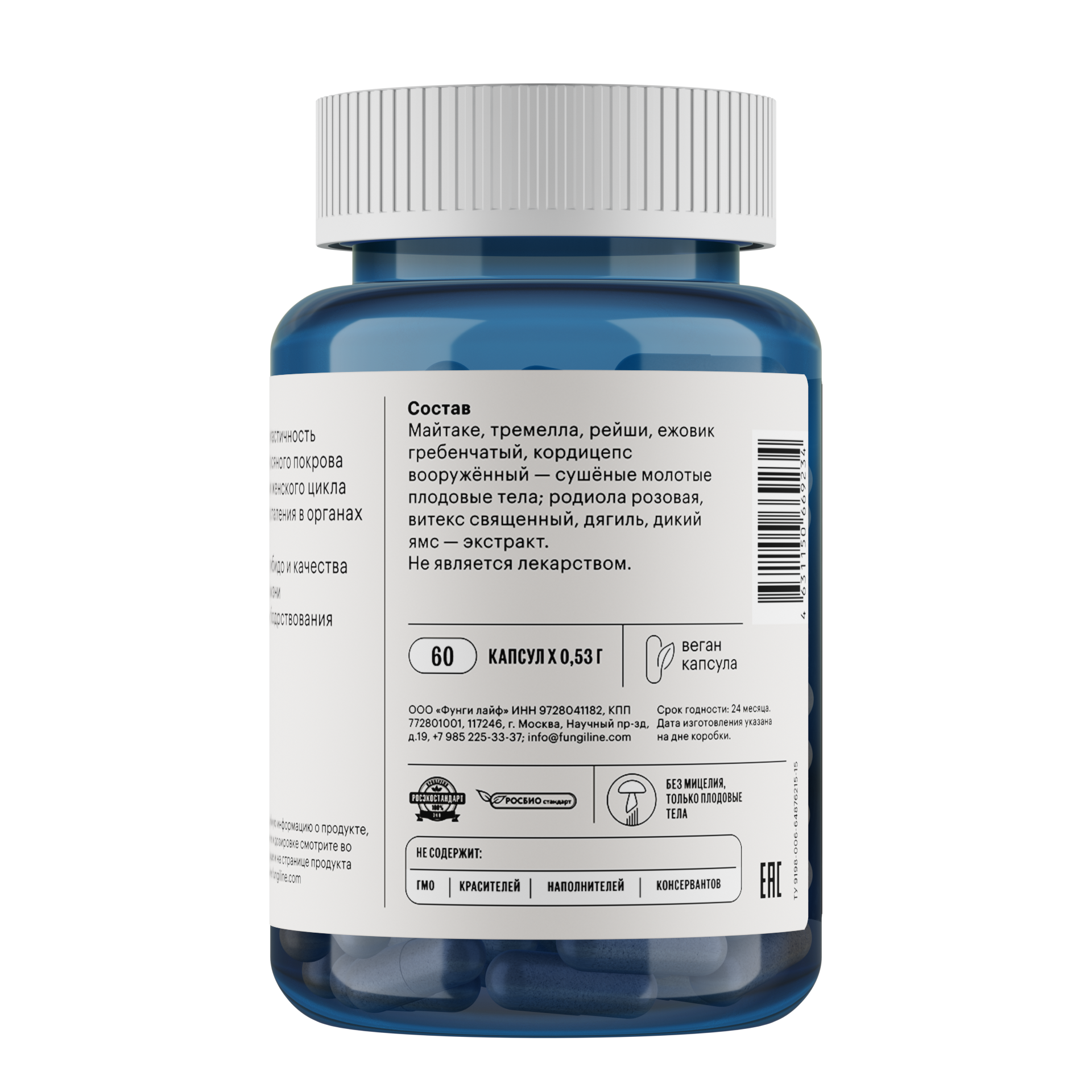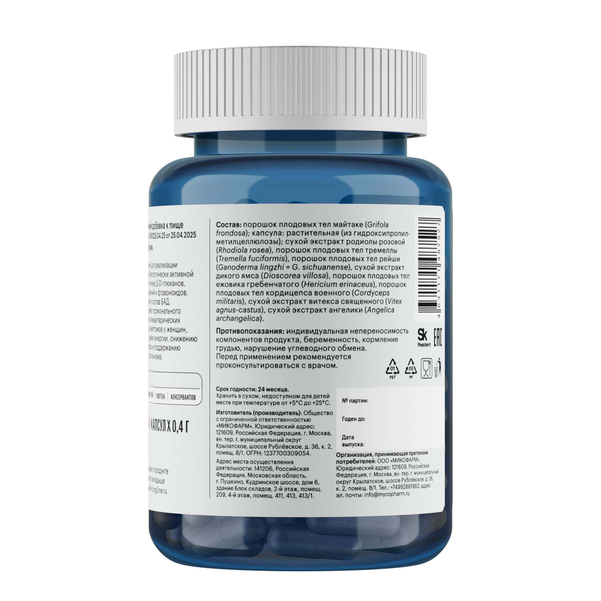 Тонкодисперсный порошок плодовых тел майтаке, тремеллы, рейши, ежовика гребенчатого и кордицепса военного (низкотемпературная сушка); экстракты витекса священного, дягиля, родиолы розовой и дикого ямса.