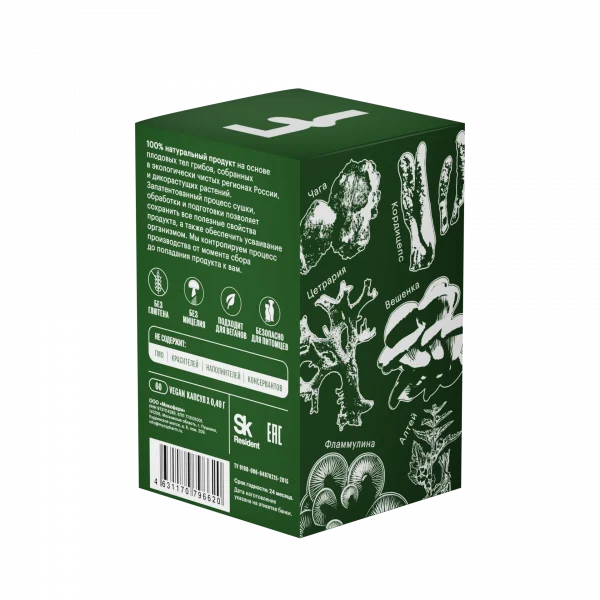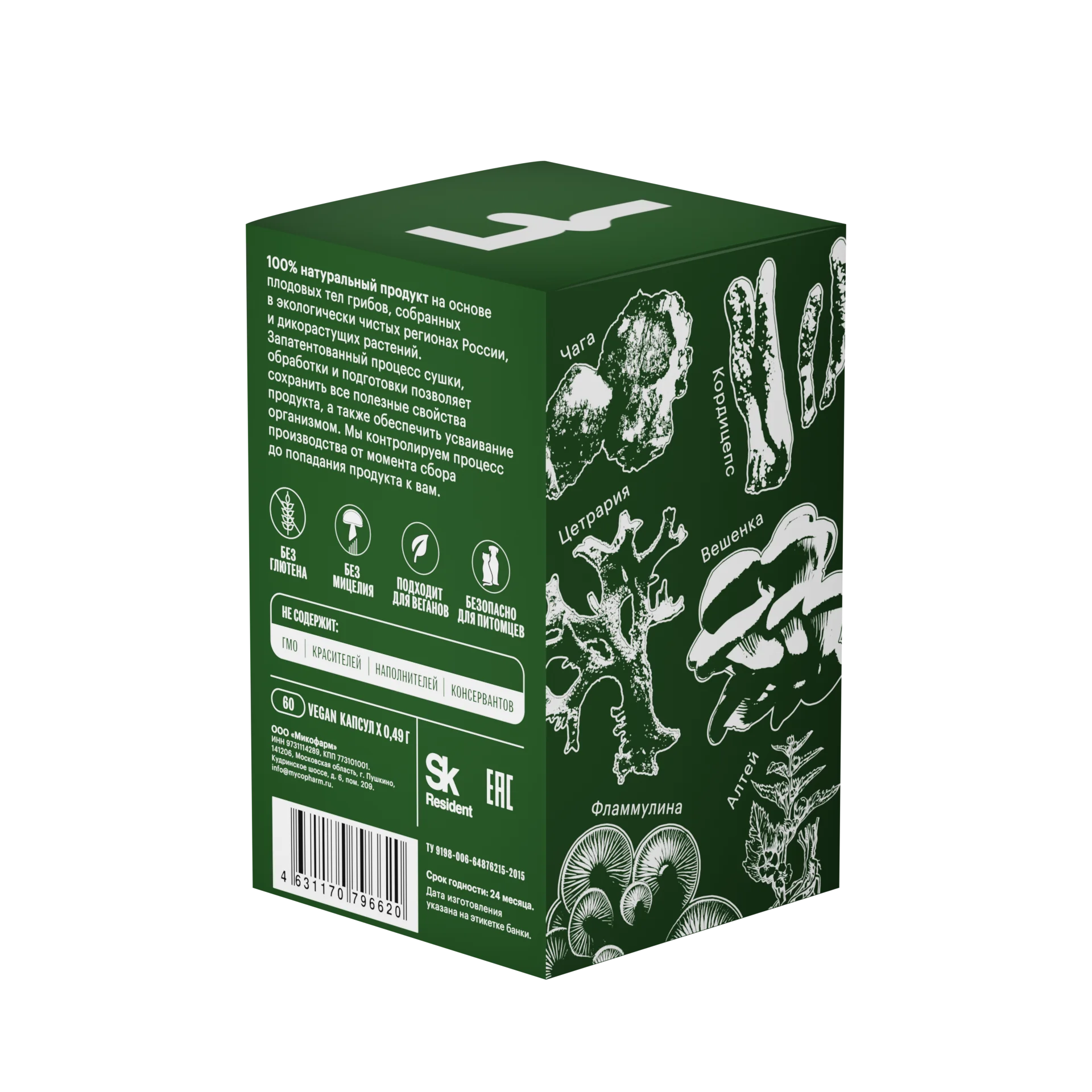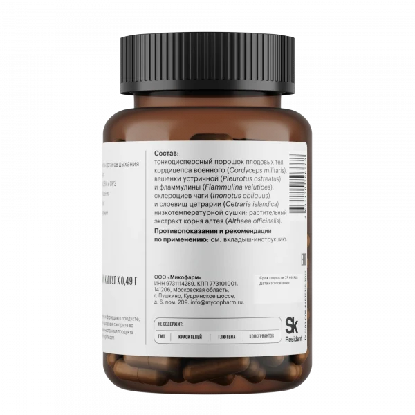 Тонкодисперсный порошок плодовых тел кордицепса военного (Cordyceps militaris), вешенки устричной (Pleurotus ostreatus), фламмулины (Flammulina velutipes), склероциев чаги (Inonotus obliquus), экстракт слоевищ цетрарии (Cetraria islandica) низкотемпературной сушки; растительный экстракт корня алтея (Althaea officinalis)