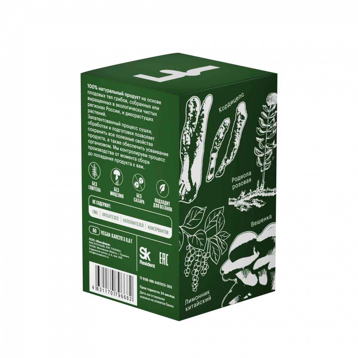 Кордицепс военный и родиола розовая — мощные адаптогены, которые эффективно борются с усталостью, повышают общий уровень энергии, помогают организму справляться с перегрузками даже в самые напряженные периоды. Вешенка устричная поддерживает иммунную систему и снижает чувство утомления.