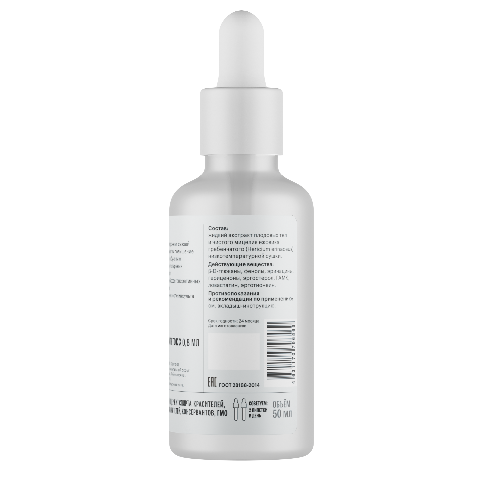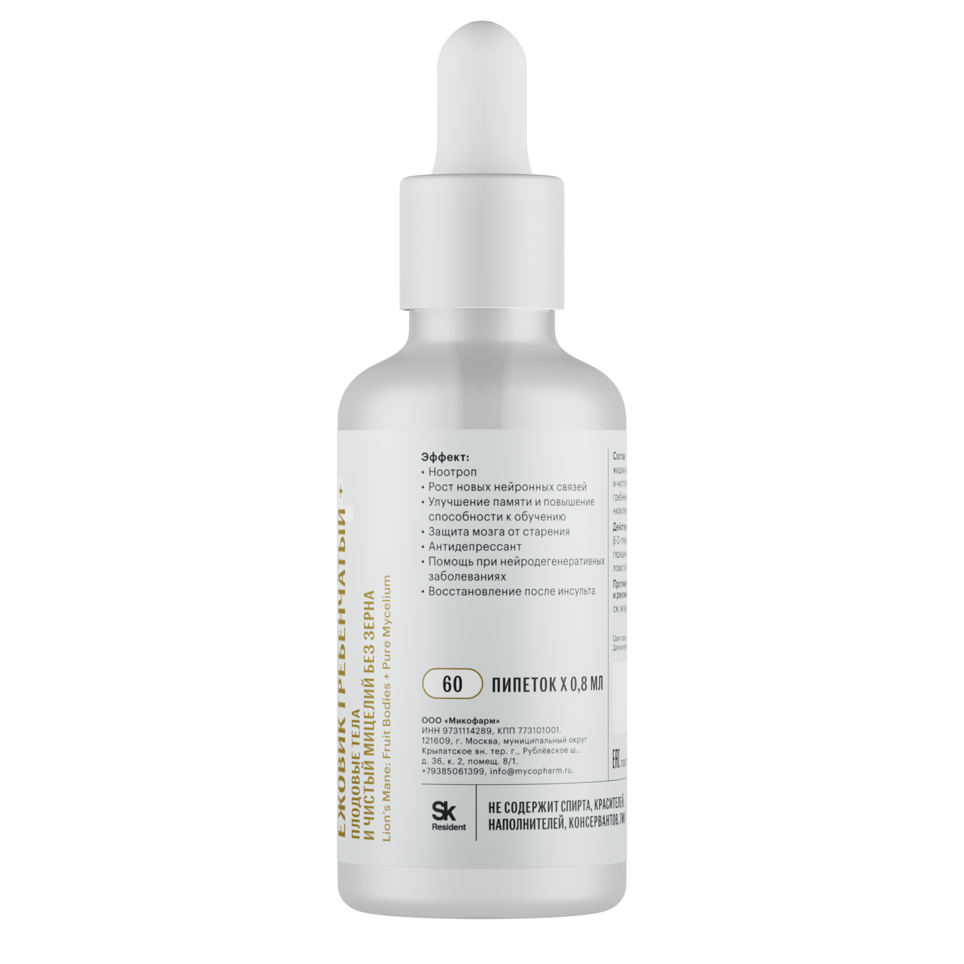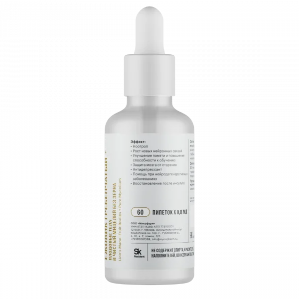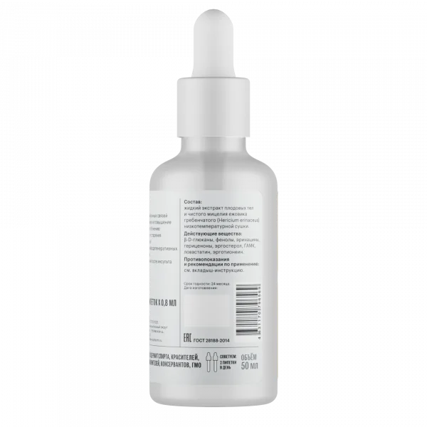 Жидкий экстракт плодовых тел и чистого (незернового) мицелия ежовика гребенчатого (Hericium erinaceus) низкотемпературной сушки.