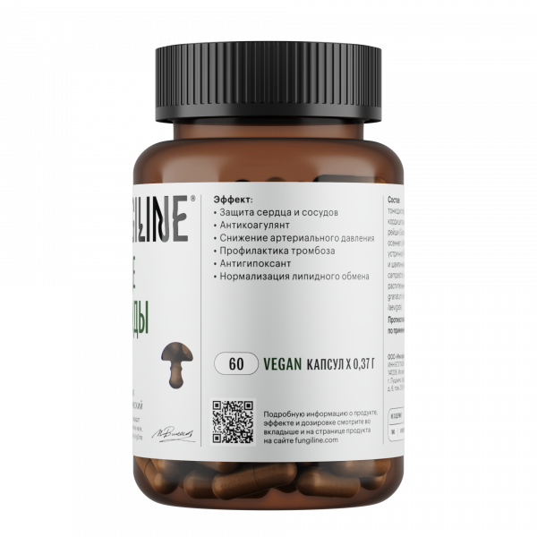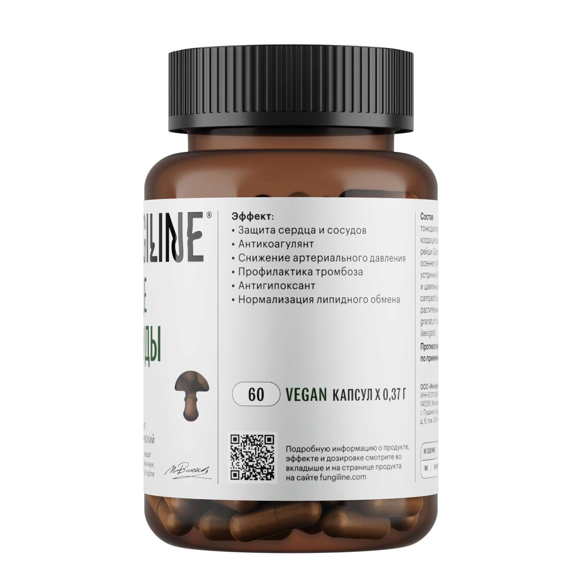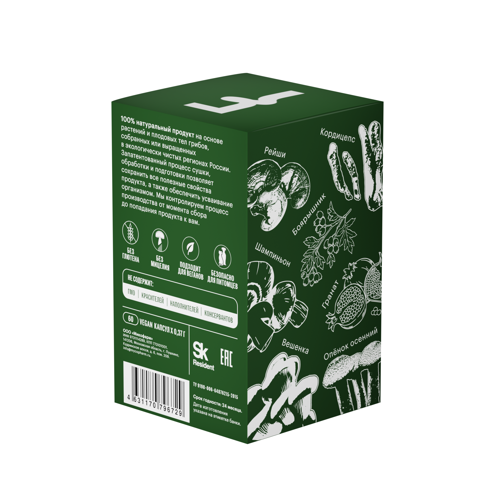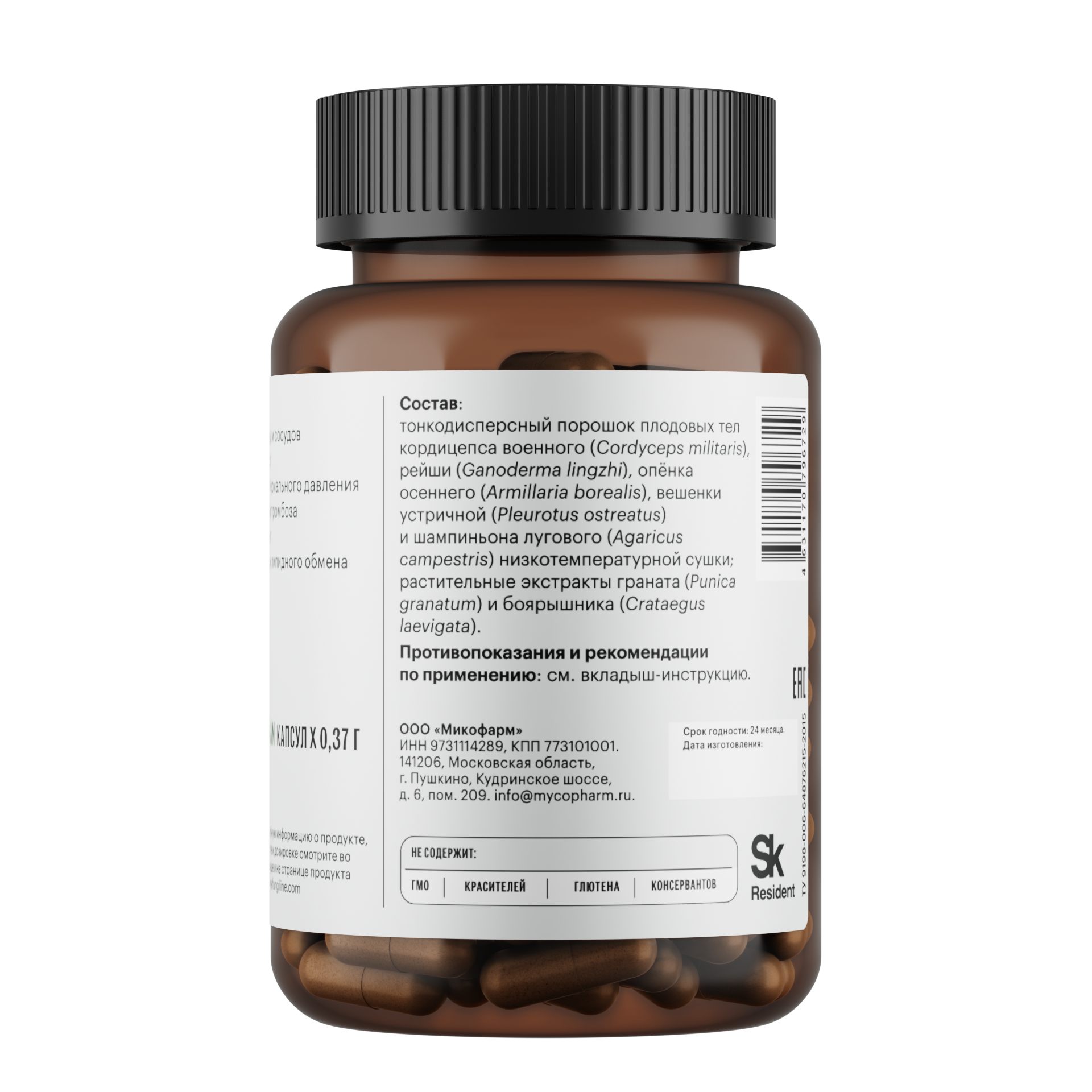 Тонкодисперсный порошок плодовых тел кордицепса военного (Cordyceps militaris), рейши (Ganoderma lingzhi), осеннего опёнка (Armillaria borealis), вешенки устричной (Pleurotus ostreatus), шампиньона лугового (Agaricus campestris) низкотемпературной сушки; экстракт граната (Punica granatum), экстракт боярышника (Crataegus laevigata).
