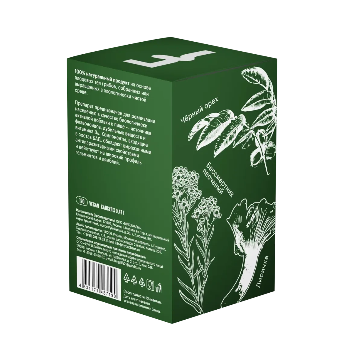 Юглон черного ореха и полисахариды лисички провоцируют гибель паразитов и выводят их из организма вместе с продуктами жизнедеятельности, снижая интоксикацию и воспаление.
