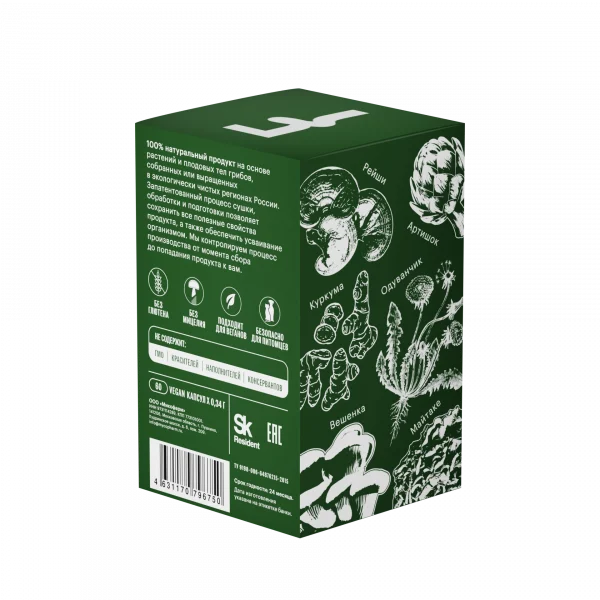Тонкодисперсный порошок плодовых тел рейши (Ganoderma lingzhi), майтаке (Grifola frondosa), вешенки устричной (Pleurotus ostreatus) низкотемпературной сушки; экстракт куркумы (Curcuma longa), экстракт корня одуванчика (Taraxacum officinale), экстракт артишока (Cynara scolymus).