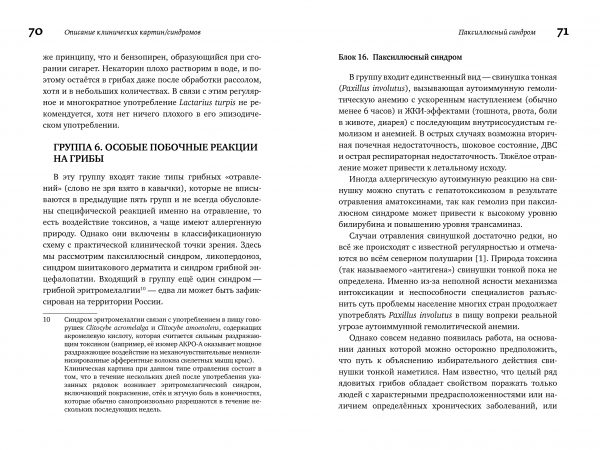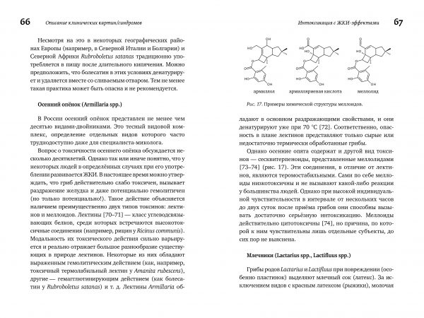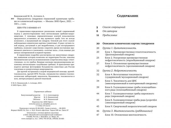 В справочнике подробно рассмотрены все микогенные синдромы, выявление которых возможно на территории России, описаны биохимические пути их возникновения и перечислены виды «ответственных» за это грибов. Впервые наглядно проанализированы особые механизмы интоксикации некоторыми грибами, которые традиционно считаются съедобными. В приложении приводятся цветные фотографии большинства известных для России токсичных и аллергогенных макромицетов.