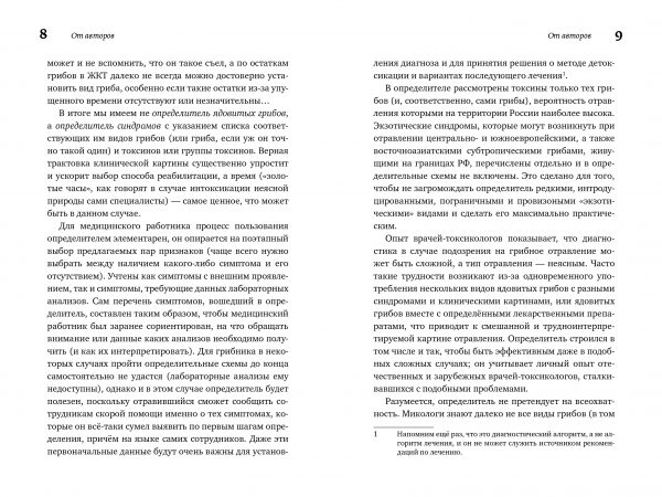 В справочнике-определителе реализован новый современный подход к диагностированию типа интоксикации грибами-макромицетами. С помощью определительных ключей пользователю предлагается установить не вид ядовитого гриба (что не всегда возможно), а вызываемый им синдром. Основой для этого служит наблюдаемая клиническая картина (симптомы). В ряде случаев такой подход, доступный и для медработника, и для пострадавшего грибника, позволит существенно сократить время постановки правильного диагноза и сэкономить «золотые часы», столь важные для начала своевременной и верной терапии.