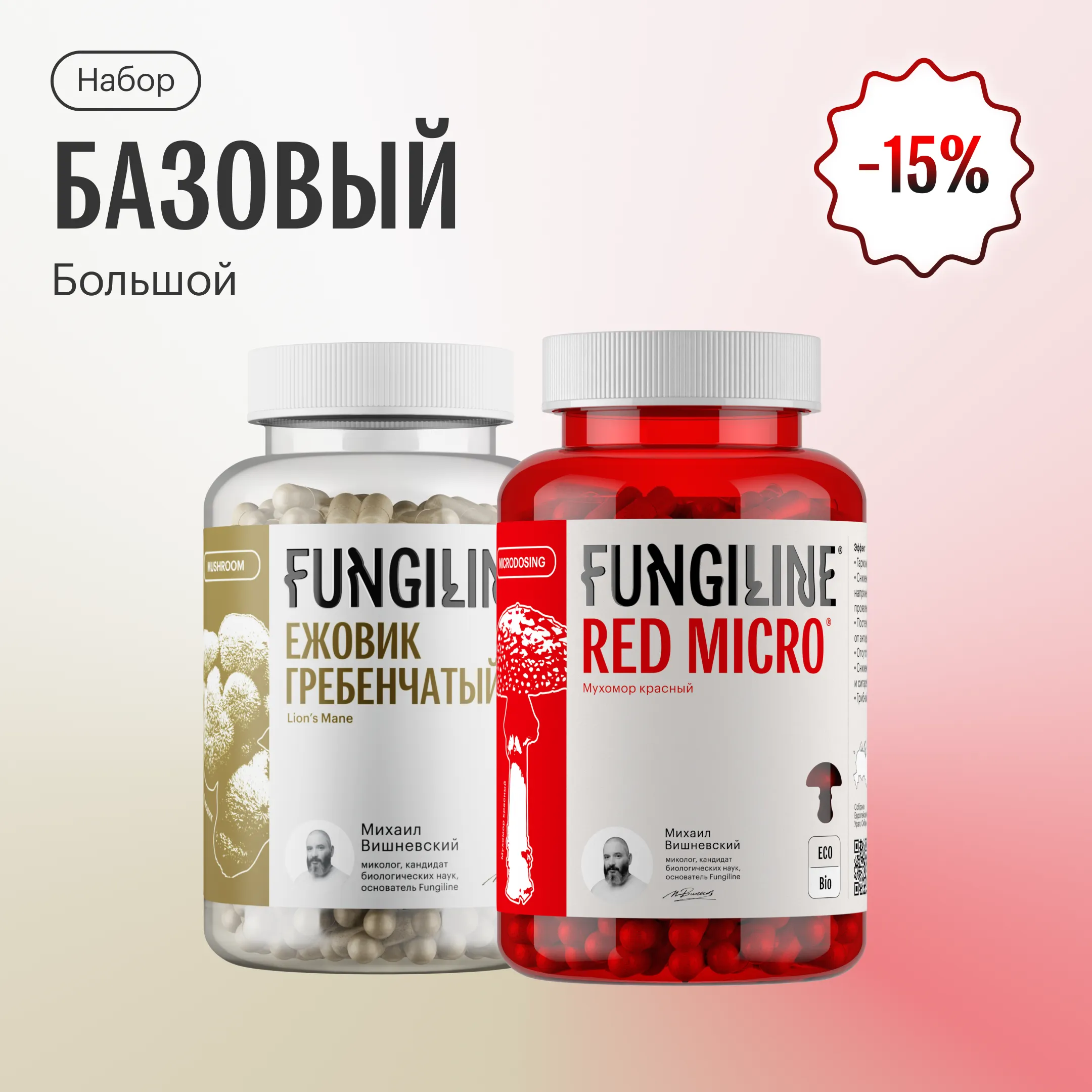 Набор БАЗОВЫЙ включает в себя самые популярные продукты грибной аптеки FUNGILINE, отлично дополняющие друг друга: Red Micro 120 капсул + Ежовик Гребенчатый 120 капсул — лучший инструмент для работы с психо-эмоциональным состоянием