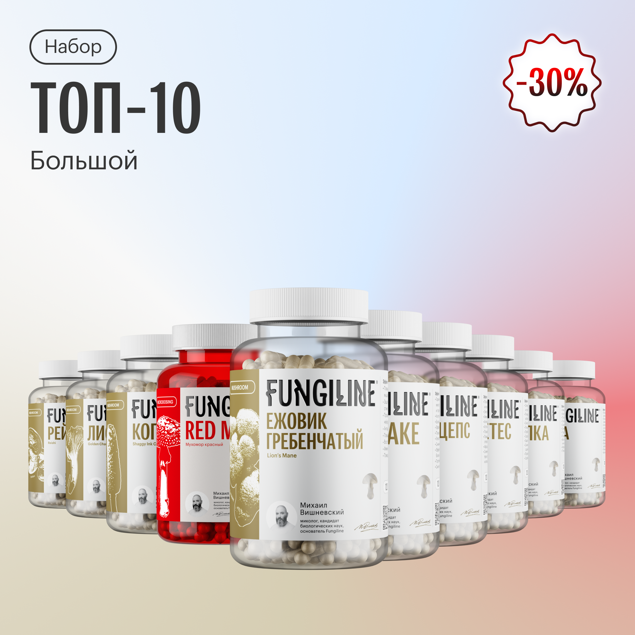 Набор ТОП-10 включает в себя 10 лучших продуктов из линейки грибной аптеки FUNGILINE: Red Micro + Ежовик Гребенчатый + Кордицепс + Чага + Рейши + Веселка + Траметес + Лисички + Копринус + Майтаке. Все продукты в большом наборе ТОП-10 идут в размере 120 капсул