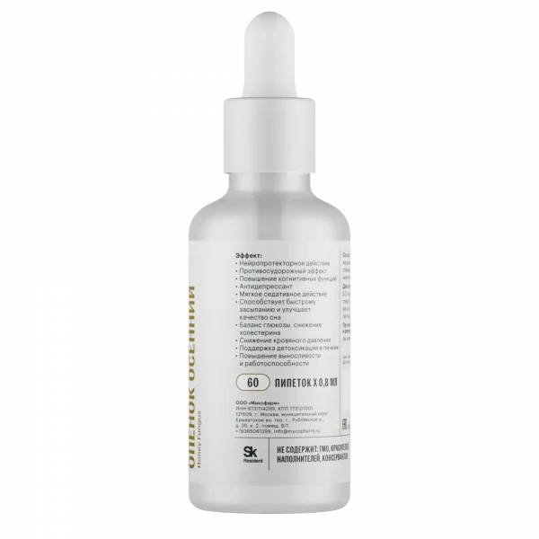 Осенний опенок способен снижать оксидативный стресс в голов ном мозге, положительно влиять на качество мембран и энергопродукцию митохондрий, увеличивать количество ацетилхолина, дофамина и ГАМК, снижая при этом уровни возбуждающего нейромедиатора глутамата. Безусловно, эти свойства осеннего опенка позволяют назвать его одним из лучших средств для профилактики нейродегенеративных заболеваний и прекрасным ноотропом с антидепрессантным действием, способствующим долголетию и когнитивному тонусу в течение жизни.