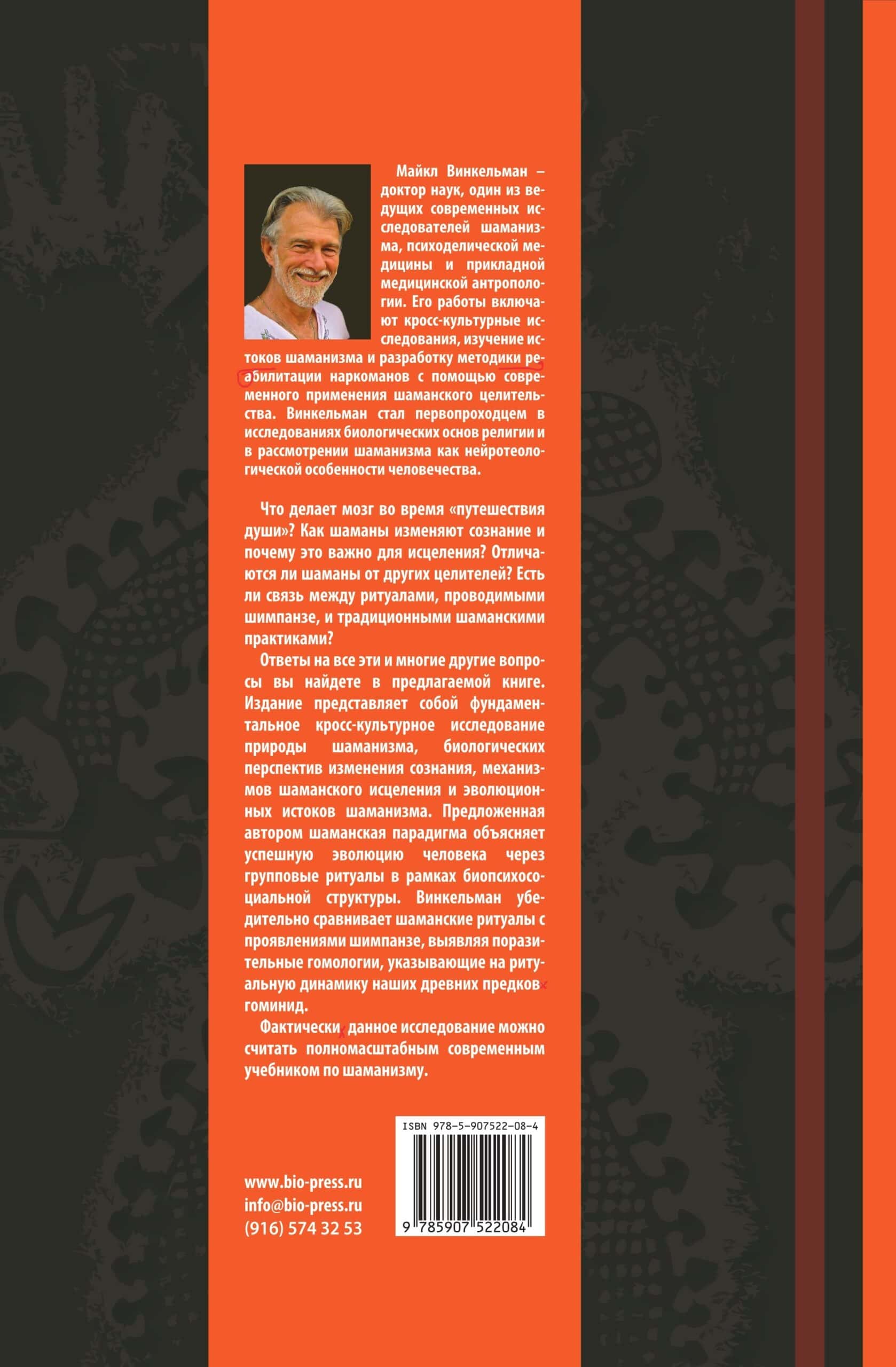 Ответы на все эти и многие другие вопросы вы найдете в книге «Шаманизм. Биопсихосоциальная парадигма сознания и целительства». Издание представляет собой фундаментальное кросс-культурное исследование природы шаманизма, биологических перспектив изменения сознания, механизмов шаманского исцеления и эволюционных истоков шаманизма. Предложенная автором шаманская парадигма объясняет успешную эволюцию человека через групповые ритуалы в рамках биопсихосоциальной структуры. В последней главе Винкельман убедительно сравнивает шаманские ритуалы с проявлениями шимпанзе, выявляя поразительные гомологии, указывающие на ритуальную динамику наших древних предков гоминид.