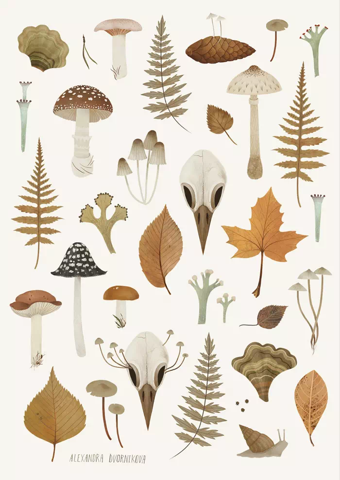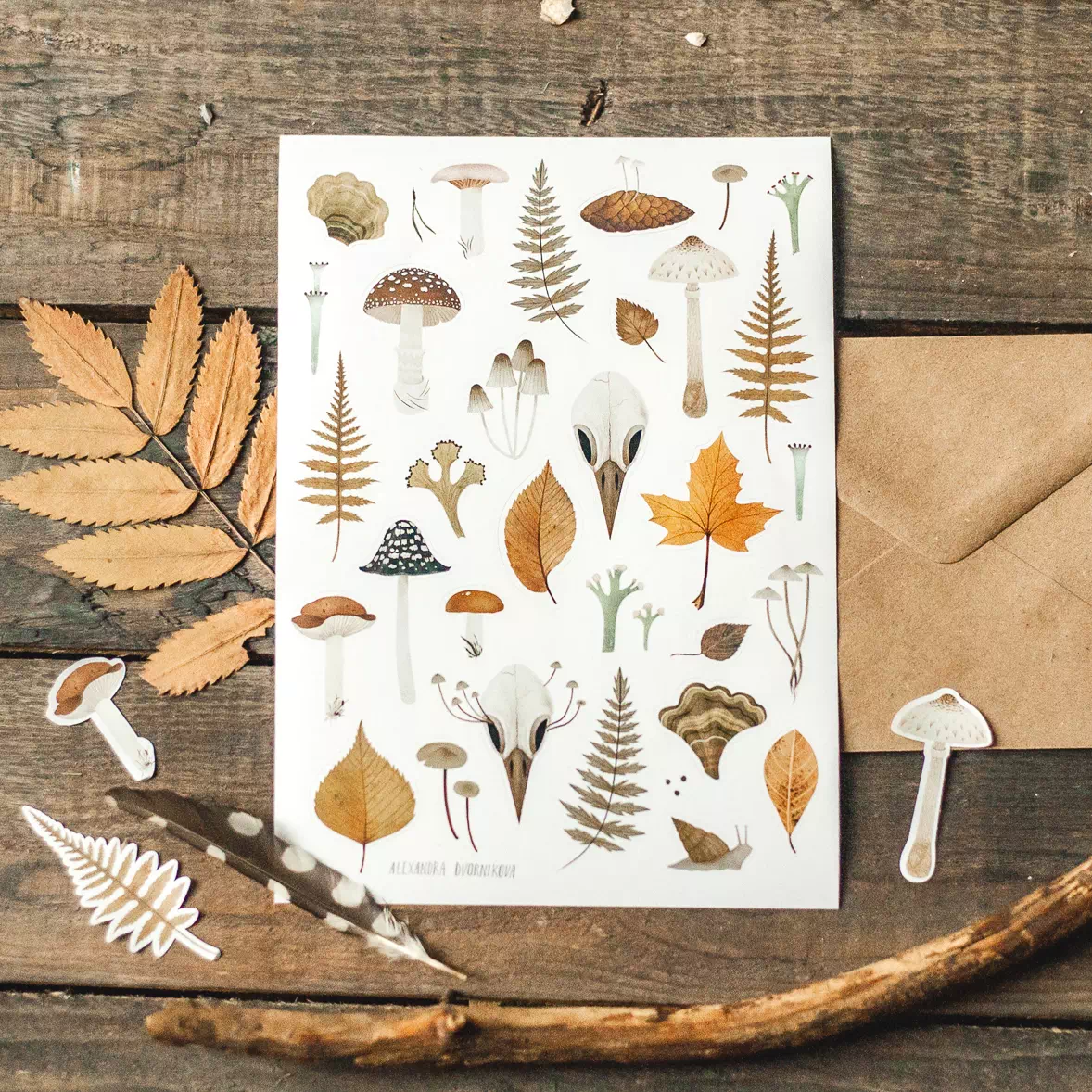 Набор стикеров «Птичий череп и листья» для любителей природы от российской художницы Александры Дворниковой.